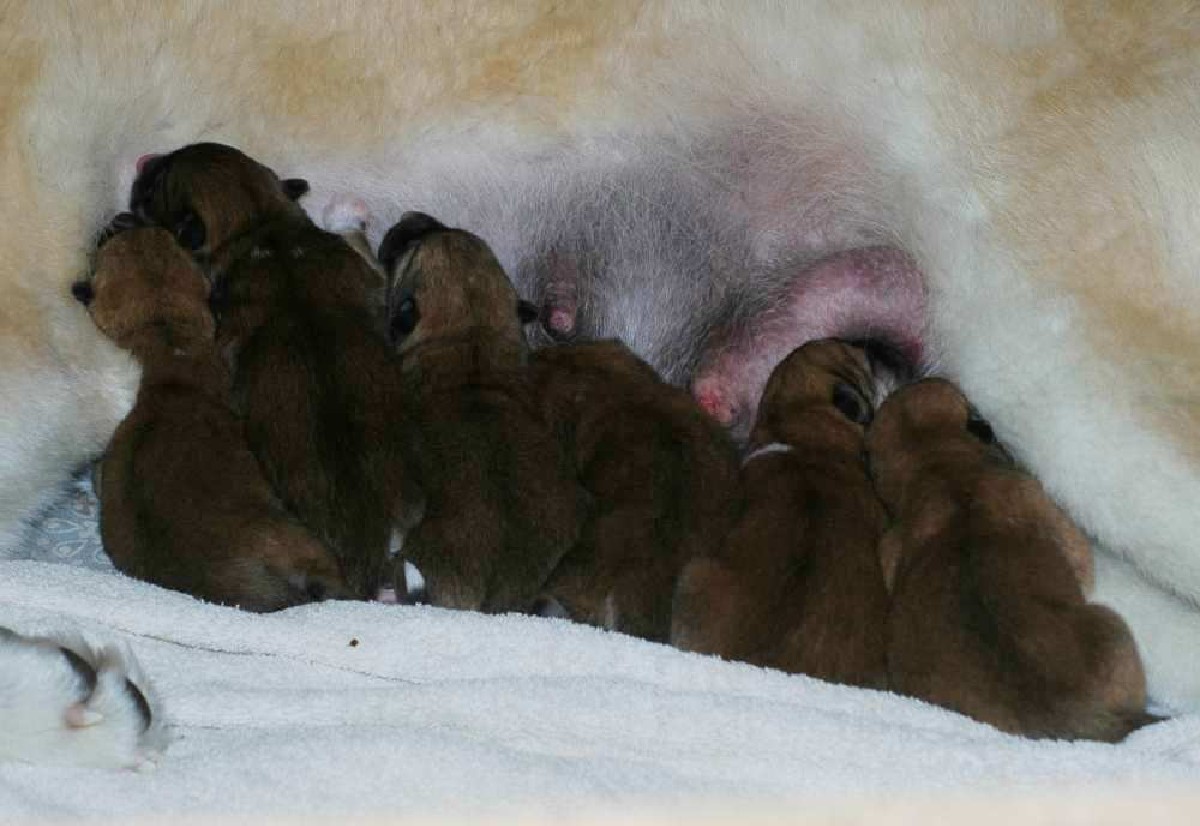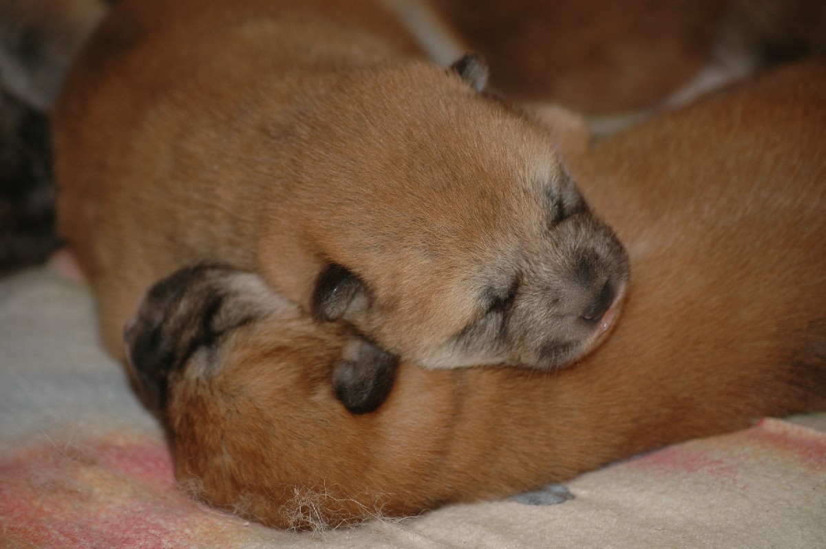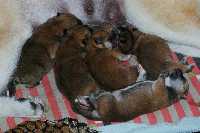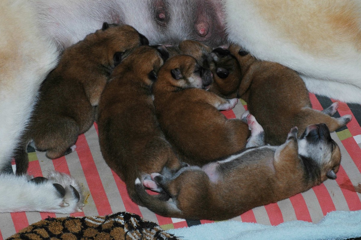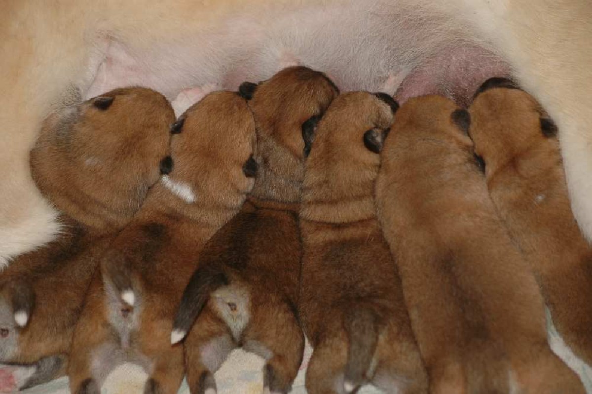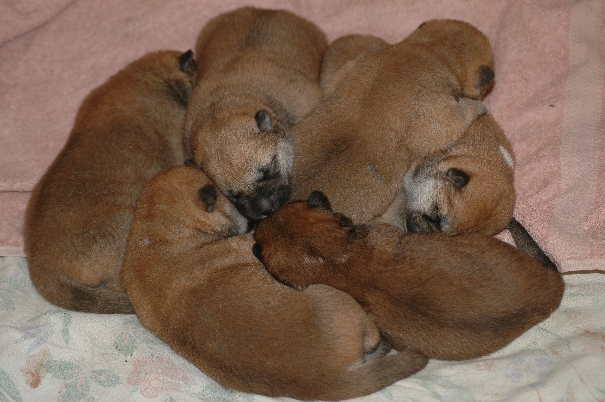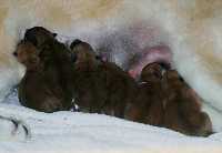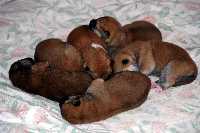 sechs dunkelrote, sehr gleichmäßige Welpen.