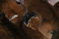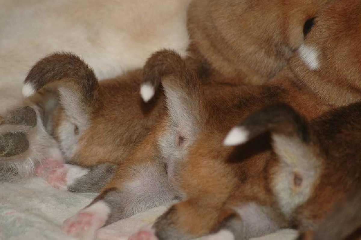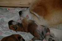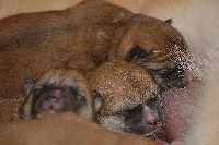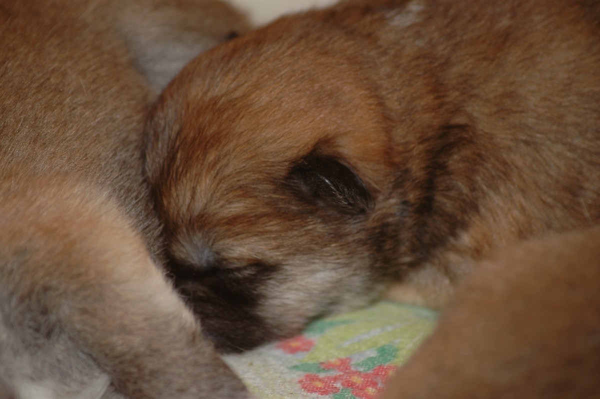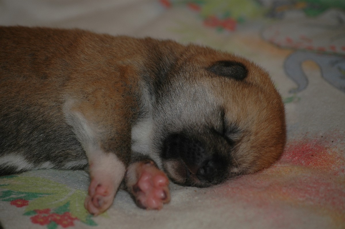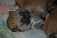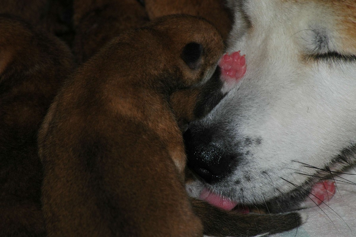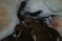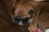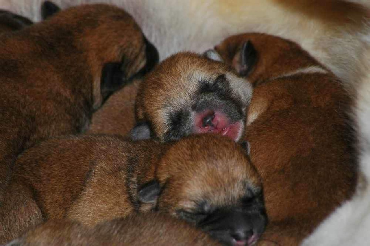 sechs dunkelrote, sehr gleichmäßige Welpen.